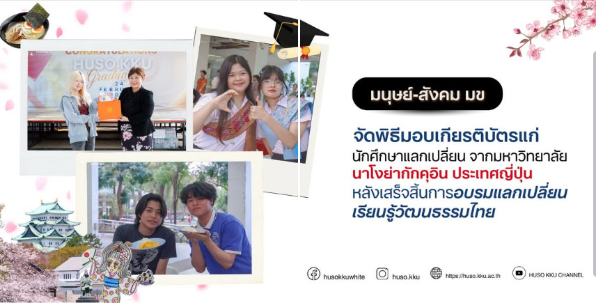 มนุษย์-สังคม มข. จัดพิธีมอบเกียรติบัตรนักศึกษาจากมหาวิทยาลัยนาโงย่ากักคุอิน ประเทศญี่ปุ่น หลังเสร็จสิ้นการอบรมแลกเปลี่ยนเรียนรู้ภาษาและวัฒนธรรมไทย