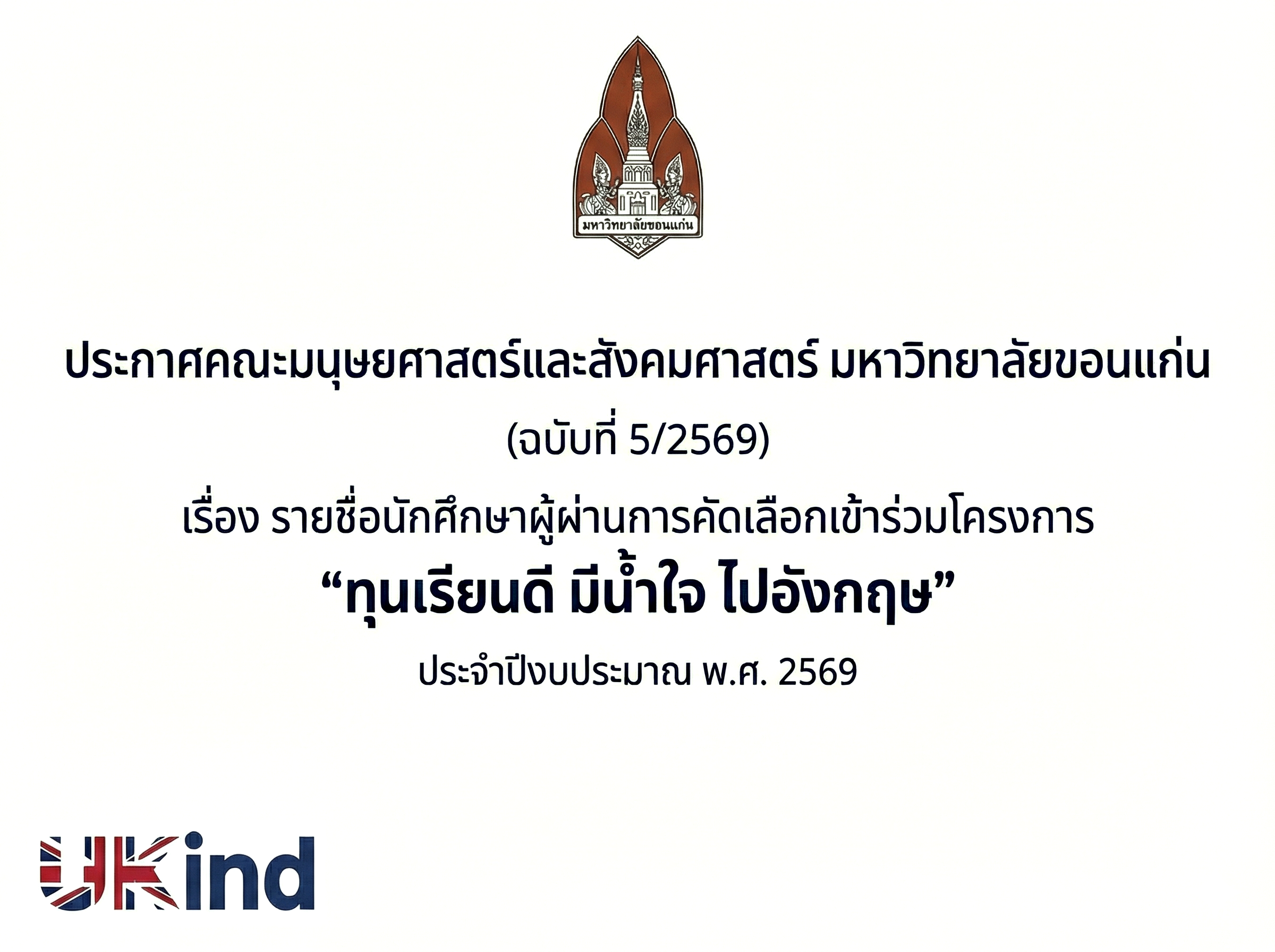 ประกาศรายชื่อนักศึกษาผู้ผ่านการคัดเลือกเข้าร่วมโครงการ "ทุนเรียนดี มีน้ำใจ ไปอังกฤษ" (UKind) 2569