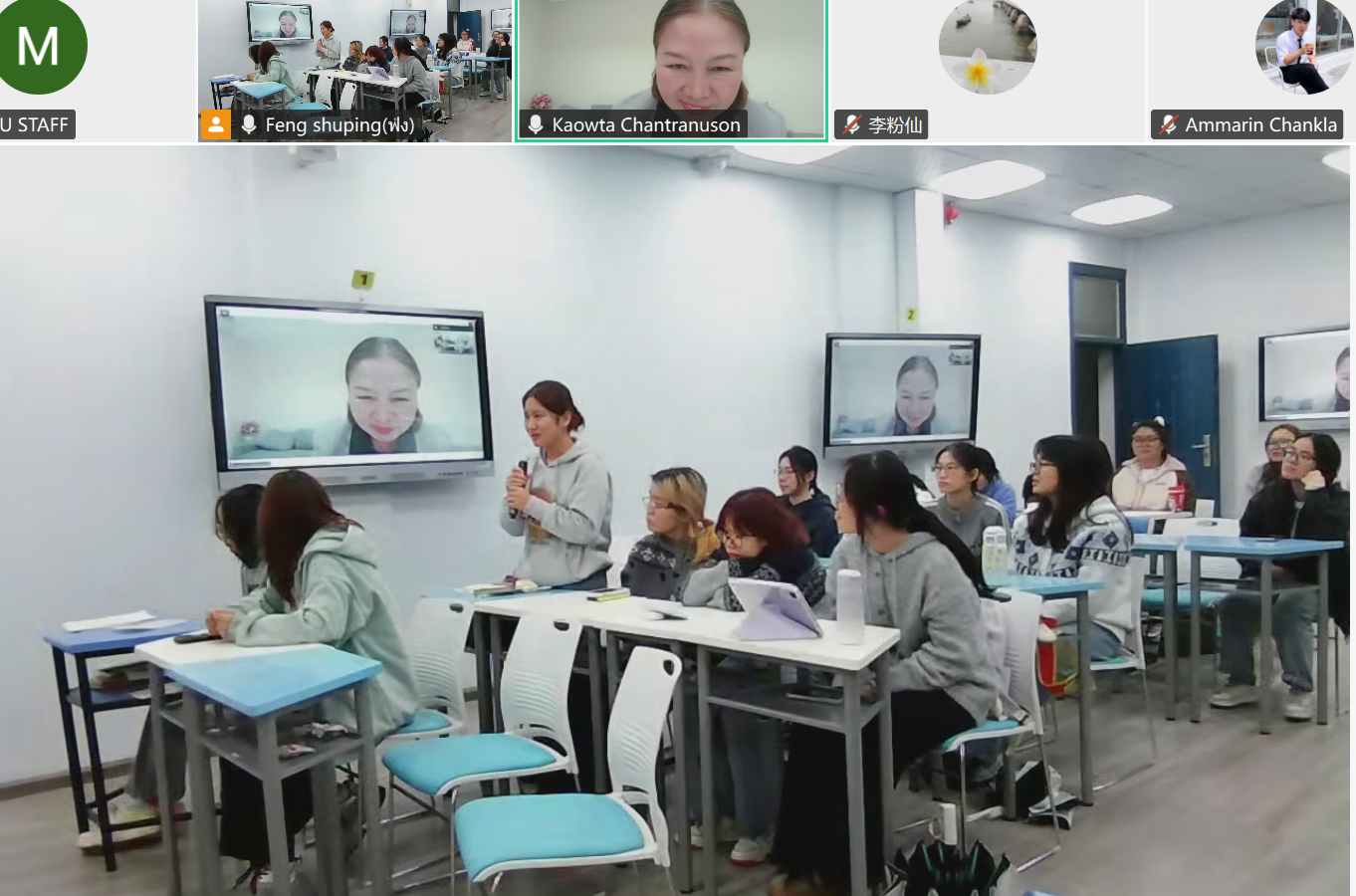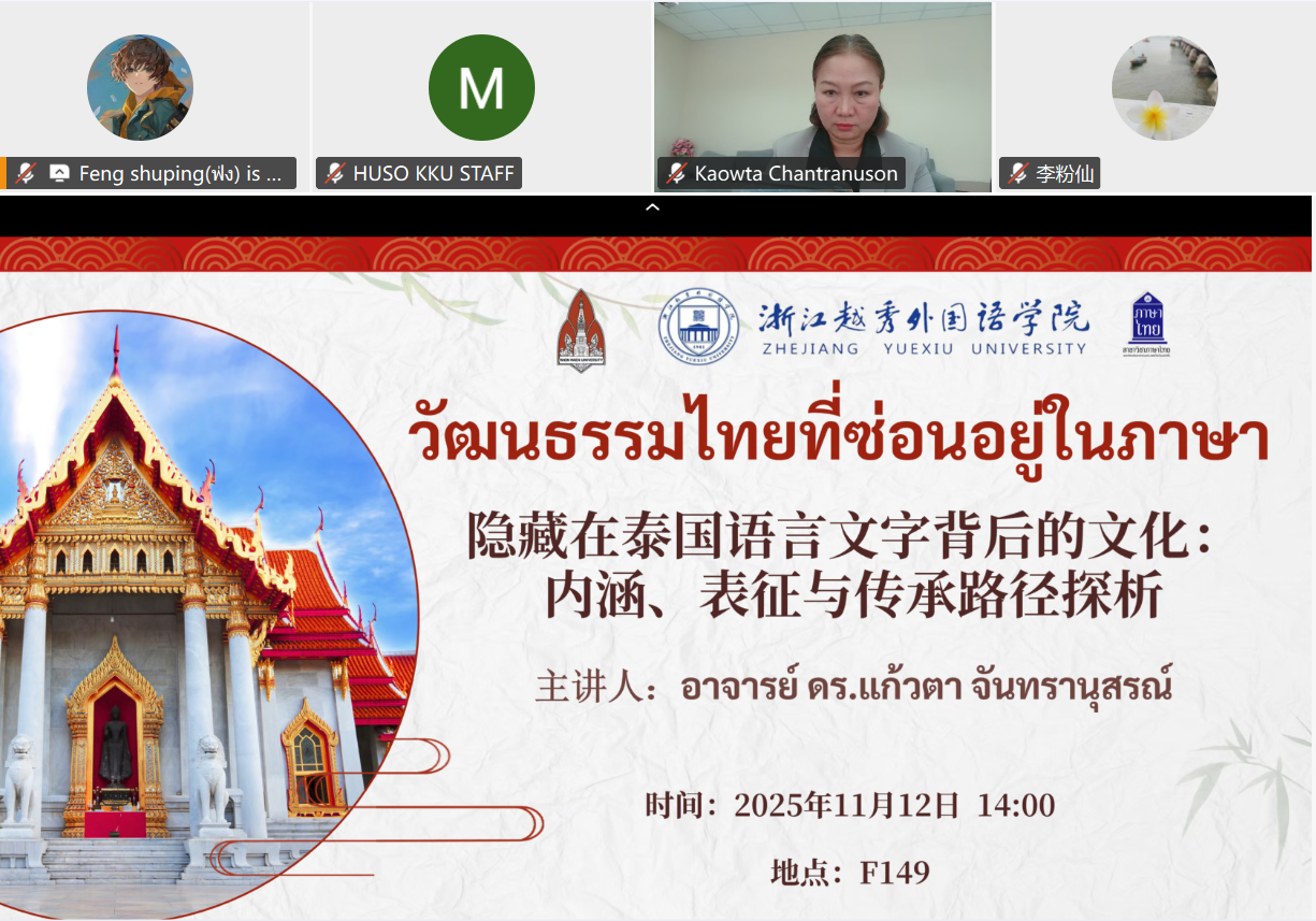 Towards the end of the session, the lecturer provided an opportunity for the faculty and students to ask questions and exchange ideas to further enhance their understanding of Thai culture as reflected through language. This lecture is part of the ongoing effort to promote academic collaboration between Khon Kaen University and Zhejiang Yuexiu University of Foreign Languages. The goal is to strengthen mutual understanding of the Thai language and culture, which will pave the way for future academic cooperation.